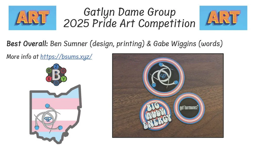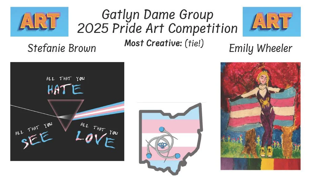 This year the Gatlyn Dame Group had an art competition to raise funds for Pride 2025. We received 11 unique submissions and subscribers to our newsletter voted to nominate “Best Overall” and “Most Creative” submissions and suggested how best to display the art. A heartfelt thank you to everyone who submitted this year, and congratulations to those whose work was displayed at our Pride booths!